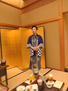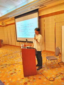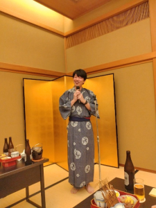 そして、各自で温泉を堪能していただいた後、大宴会場での宴会へと移りました。吉本代表幹事の乾杯の音頭で開宴し、講師の湯浅先生のご挨拶、佐々木元代表幹事を始めとする様々な方々によるスピーチへと続き、小野来年度代表幹事(予定)の締めの言葉で閉宴するまでの間、参加者の方々が自由に移動したりしながら歓談・交流し、大盛況でした。その後、広めの宿泊室での二次会も、約半数の方々がご参加くださり大いに盛り上がり、最後は、少数精鋭(?)による三次会で一日を終えました。