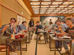一日目は、宝塚温泉ホテル若水を会場として、研修会、宴会、二次会、三次会を行いました。まず、研修会では、「生成AI の登場により知財実務はどのように変革されるのか~特許明細書作成・商標願書作成への活用について事例を踏まえながら紹介~」と題として、弁理士の湯浅竜先生に、時流を踏まえた大変有意義で示唆に富むご講義を行っていただきました。